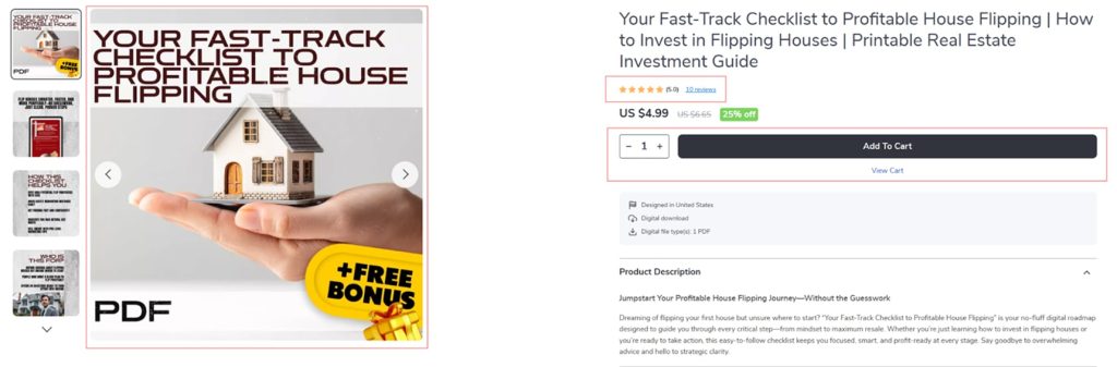 - Price + discount (if any) — if you offer sale pricing, show both the original and discounted price clearly